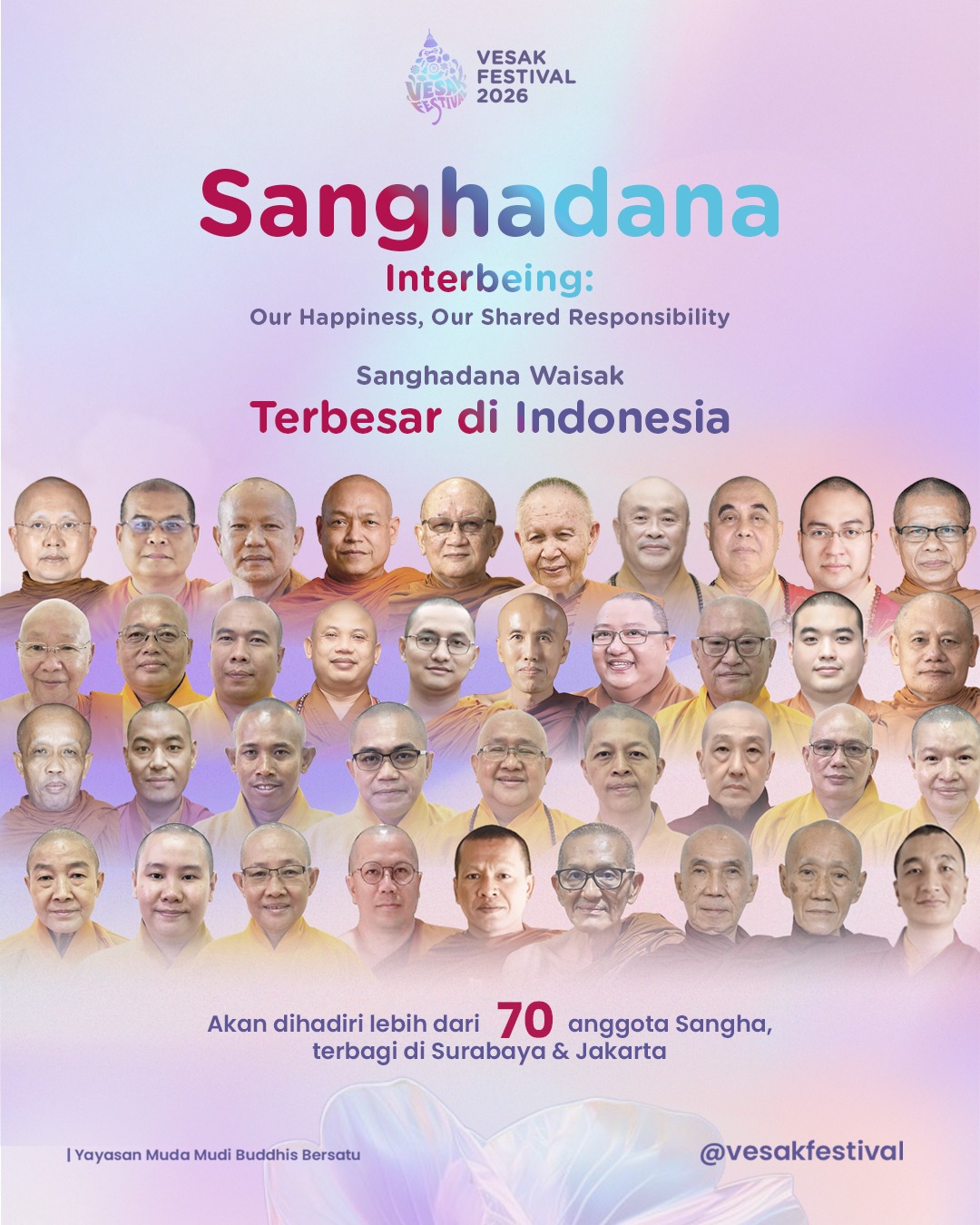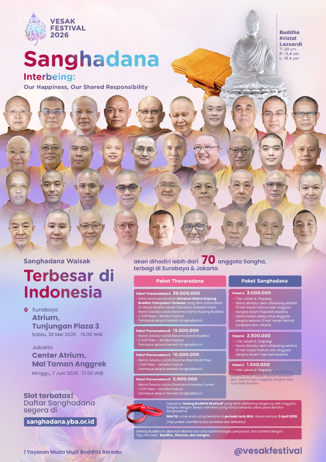 Donatur akan mendapatkan: - 1 set jubah yang akan dipersembahkan bagi anggota Sangha - 1 Rupang Buddha spesial akan di-blessing selama Vesak Festival, dan diserahkan kepada donatur selesai acara Paket Sanghadana ini dipersembahkan untuk anggota Sangha di Indonesia yang hadir di Acara Sanghadana Vesak Festival 2026. Semua laporan Sanghadana akan dipertanggungjawabkan dalam Laporan Pertanggungjawaban (LPJ) pasca acara.